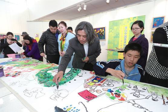 中國(guó)美術(shù)館館長(zhǎng)吳為山表示,在家長(zhǎng)和社會(huì)的呵護(hù)之下,這些孩子用手中的畫(huà)筆盡情地描繪著心中的憧憬夢(mèng)想,繪畫(huà)也帶給他們更加快樂(lè)而鮮活的生命體驗(yàn)?!八麄兊募记梢苍S不夠成熟,他們的才藝也許不夠驚艷,但他們通過(guò)作品所表現(xiàn)的,卻是最為寶貴的人類(lèi)天真。他們的作品,也引發(fā)我們?nèi)ヌ骄克囆g(shù)與藝術(shù)教育對(duì)個(gè)人的成長(zhǎng)有何作用:藝術(shù)顯然不是萬(wàn)能的,但它可以激發(fā)創(chuàng)造,開(kāi)放思維,拓展想象,豐富情感,放松身心?!眳菫樯脚c參加活動(dòng)的5位自閉癥孩子現(xiàn)場(chǎng)共同創(chuàng)作《春天》。孩子們用丙烯顏料在一張寬90厘米、長(zhǎng)4米的畫(huà)布上縱情揮灑,描繪他們對(duì)美麗春天的感受和向往。