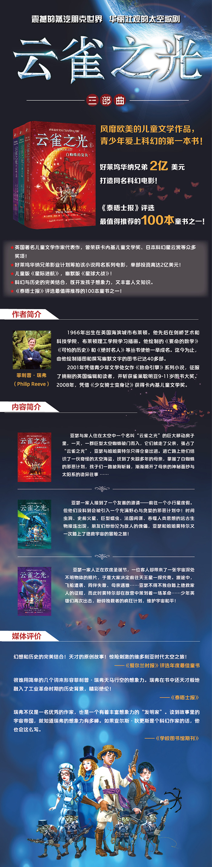 好萊塢2億美元打造同名科幻電影!《泰晤士報》評選值得推薦的100本童書之一。真實的歷史背景,震撼的蒸汽朋克世界,華麗壯觀的太空歌劇!青少年愛上科幻的書!