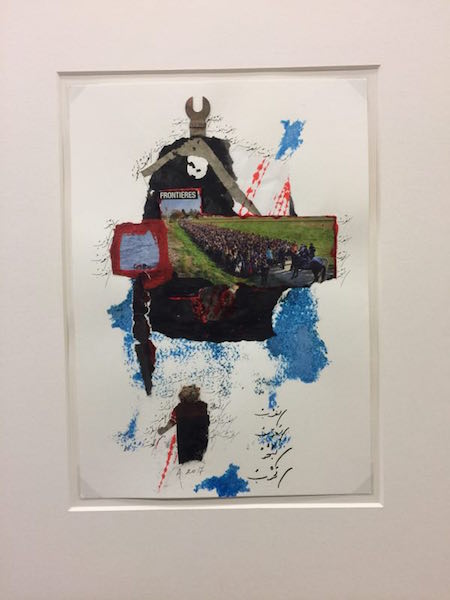 阿多尼斯寫詩有60多年,藝術創(chuàng)作還只是最近十幾年的事。 他在晚餐桌上告訴我他是怎么開始辦畫展的趣事。他用謙虛的口吻說,他本來只是自得其樂,腦子累了,畫畫作為一種放松。有一天巴黎一個開畫廊的朋友來他那里做客,看到這些拼貼藝術,問是誰的,阿多尼斯說是一個朋友畫的,畫廊朋友說特別喜歡,阿多尼斯便和他約好和藝術家見面。那天到了,畫廊朋友來了,阿多尼斯就拿出他的一些作品讓他看,看著看著,他問藝術家在哪里,最后才知道阿多尼斯就是那個藝術家。