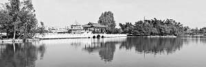 想來,朱先生在那五個(gè)月中,每一個(gè)清晨或是黃昏,他都會(huì)順著這南湖走上一遭。湖堤上種了成行的尤加利樹,高而直的樹干,細(xì)而長的葉子,像慣于拂水的垂楊。朱先生一站到堤上就會(huì)想到北平的什剎海,南湖也有荷花,讓先生覺得更像什剎海了。