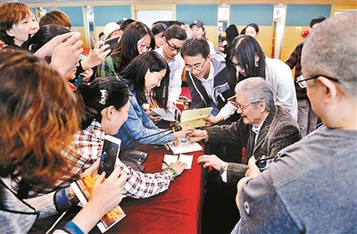 作為青睞講座與北京人藝合作的“北京人藝建院65周年”系列講座第三期活動(dòng),藍(lán)天野先生將做客北京青年報(bào)第35期青睞講座的消息剛一發(fā)出,一晚上即報(bào)名人數(shù)突破百人,“老神仙”的影響力可見一斑。4月23日,藍(lán)天野先生如約而至,90歲高齡卻依舊風(fēng)度翩翩,拐棍在他手里像是文明棍,似乎只是為了增添他的風(fēng)度。老先生兩個(gè)小時(shí)的講座完全脫稿,大家聽得屏氣凝神津津有味,他卻為沒有稿子感到有些抱歉,他說以往自己的講座都會(huì)寫稿,可是這次因?yàn)樗淮_定是什么樣的讀者來聽,不知道大家愛聽哪方面的,就沒有準(zhǔn)備文字內(nèi)容。而事實(shí)上,藍(lán)天野先生講座時(shí)思路清晰,語言嚴(yán)謹(jǐn),令人嘆服,而其多年練就的聲音功力,更是使得其每個(gè)音節(jié)都發(fā)音清楚,不用麥克風(fēng),也可傳遞到最后一排觀眾的耳中。