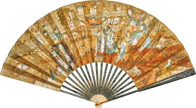 來自意大利波旁家族雙西西里的公主嫁入法國皇室,成為貝利公爵夫人,她為參加?xùn)|方主題舞會特地定制了這把折扇。扇上畫的是中國古戰(zhàn)場一將誘敵深入的故事。此扇不僅扇骨用金漆工藝,扇面也漆工藝粘嵌貝母,模仿中國螺鈿工藝。此扇尺寸碩大,工藝夸張,特為交際場合的風(fēng)情炫耀而制作。相比之下,道光帝御題的折扇才真正是隨身揮舞納涼的日常之物,扇上詩畫呈現(xiàn)出道光皇帝的閑吟逸趣。