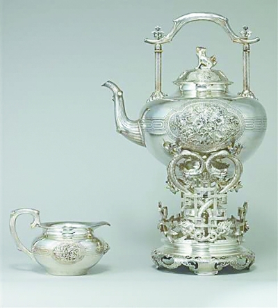 盧浮宮藏中國風(fēng)茶壺與奶壺是19世紀(jì)中期法國經(jīng)典的“中國風(fēng)”設(shè)計(jì)。與早期洛可可風(fēng)格的虛幻想象、輕浮繁縟相比,此時期表現(xiàn)出的中國元素有根有據(jù),壺身形態(tài)與開光紋飾、壺蓋的獸形鈕,以及壺流及提梁的樹干造型都模仿得頗為精心。壺的龍紋支架及底座造型也很傳神。這些中國風(fēng)銀茶具如此精美大氣,可見飲茶在當(dāng)時巴黎上層社會,仍被作為高尚奢華的生活內(nèi)容來表現(xiàn)。