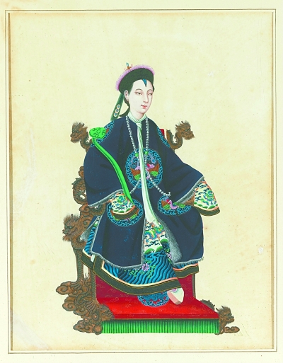 法國人不能確定這幅人物畫像的身份,甚至有人名之曰“中國皇后像”,從畫中各種服飾特征看,這根本不是皇后的裝束。實(shí)際上,在1901年以前,西方商人和使節(jié)也見不到中國皇宮中的后妃。畫像中很多細(xì)節(jié)特征并非完全捕風(fēng)捉影,但當(dāng)這些特征組合于一身時就顯得荒誕走形了。應(yīng)該說這是一幅想象中的中國貴婦人畫像,并非寫實(shí)。清代后妃和官員夫人們身著朝服袍褂時會佩戴三掛朝珠,畫像中只畫了左右兩肩斜戴的兩掛,缺了正中套在脖頸上的最重要的一掛。
