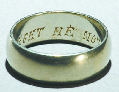 民國十一年,仍居住在故宮后寢區(qū)域的遜帝溥儀娶了內(nèi)務(wù)府大臣郭布羅·榮源的女兒婉容。婉容和溥儀都接受過詩書和英文教育。這對年輕的貴族小夫妻性情投合,在生活方式上一起追逐時尚。他們的一對鎳金戒指外圈光素,只在戒指內(nèi)壁鏨刻字樣,一枚為英文“I LOVE YOU FORGET ME NOT”(我愛你,勿忘我),另一枚為漢字“允執(zhí)厥中,惟精惟一”,此八字出自《尚書》,為清代帝王珍重的政治修養(yǎng)箴言,意喻帝王應(yīng)信守中正,精純專一?,F(xiàn)在看來,這兩枚戒指沒有什么特別之處,但在當(dāng)時也代表著一種新材質(zhì)新風(fēng)格的流行。
