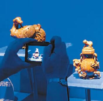5月8日,“紫禁城與‘海上絲綢之路’”展開(kāi)幕式上,觀眾正在拍攝金星玻璃燒造的系列工藝品。本報(bào)記者 王國(guó)平攝 光明圖片