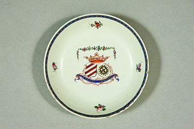 據(jù)介紹,故宮所藏的這個(gè)瓷盤,紋章是荷蘭范·斯賓與范·霍根多普兩大家族的徽章組合。瓷盤的主人是范·斯賓男爵(1746~1827年)與其妻薩拉·喬安娜(1755~1828年),可能是1785年兩人為了慶祝銅婚紀(jì)念而專門定制的瓷器。荷蘭阿姆斯特丹博物館藏有一件同樣的徽章瓷盤,器形為花瓣口,應(yīng)屬于同一套瓷器。