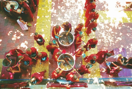緬甸仰光佛學(xué)院用午膳的僧侶
