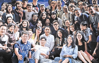 更讓人暖心的是,為了讓每個(gè)觀眾都可看到他,馮遠(yuǎn)征兩個(gè)多小時(shí)的講座始終站著。為他準(zhǔn)備的桌子、椅子和茶杯成了安靜的道具,且細(xì)心地考慮到三面座位的觀眾,馮遠(yuǎn)征會(huì)不時(shí)轉(zhuǎn)向各個(gè)方向,讓身處劇場(chǎng)角落的觀眾也似乎感覺(jué)馮遠(yuǎn)征一直在看著他講。結(jié)束時(shí),馮遠(yuǎn)征更是恭敬地沖三面觀眾鞠躬致謝。而在已經(jīng)進(jìn)入人藝會(huì)議室準(zhǔn)備回家時(shí),聽(tīng)說(shuō)劇場(chǎng)里的讀者想與他合影,馮遠(yuǎn)征立刻跑出來(lái),并且一下子坐到地上,邀請(qǐng)大家,“來(lái)吧!”于是講座時(shí)有些拘謹(jǐn)?shù)淖x者,立刻瘋狂起來(lái),沖到馮遠(yuǎn)征身邊,與這位表演大家幸福留影。
