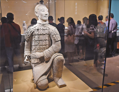 圖為18日,觀眾在首都博物館欣賞秦始皇陵兵馬俑一號(hào)坑出土的跪射俑。 新華社記者 羅曉光攝