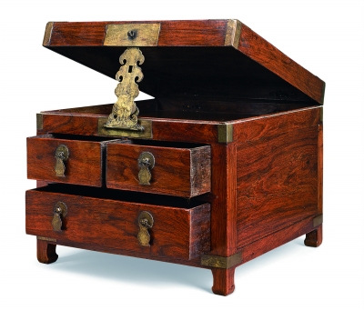 另一個(gè)清康熙時(shí)期的黃花梨帶屜小箱則凸顯出設(shè)計(jì)的精巧。此方角柜式箱,不設(shè)門板,外觀即可見(jiàn)平列的兩層抽屜,上層為二,下層為一,共三具,抽屜臉上飾菊花瓣護(hù)眼和瓶形吊牌。小箱正面鑲長(zhǎng)方形面葉,長(zhǎng)長(zhǎng)的云頭紋狀拍子,恰好扣入上下兩個(gè)鎖鼻,可單獨(dú)打開上層或下層空間,頂蓋掀起后,亦可以云頭紋銅飾件支起,頗為巧妙。蓋頂包銅角,四足下端包銅條,增加穩(wěn)固性,底收扁馬蹄。