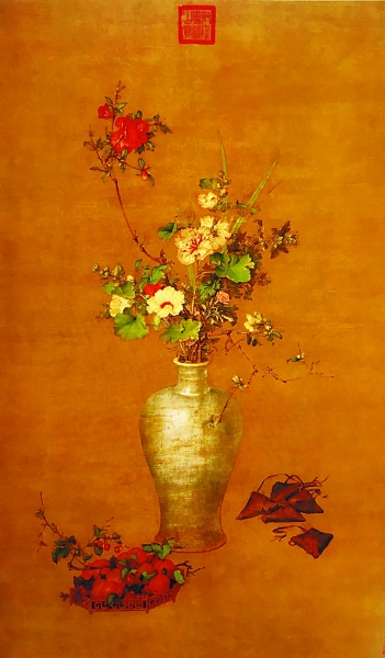 為中華文化所折服的西洋畫家郎世寧,也來湊端午的熱鬧。溫潤厚重的青瓷花瓶、瑰麗華美的夏日之花,襯著青青的艾葉,透出繁榮的五月景象。幾枚古銅色的包粽、一盒花果,畫面烘托的是“富貴吉祥”的安康知足。