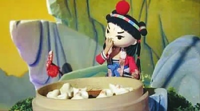 1958年出品的 《豬八戒吃西瓜》,則為中國(guó)動(dòng)畫增添了剪紙動(dòng)畫這么一個(gè)新品種,將中國(guó)最普及的民間傳統(tǒng)裝飾藝術(shù)之一剪紙運(yùn)用到了動(dòng)畫作品中。人物造型依靠平面雕鏤,動(dòng)作吸取皮影戲裝配關(guān)節(jié)以操縱人物動(dòng)作的經(jīng)驗(yàn),環(huán)境空間則由繪制的紙片及貼在玻璃上的前后景構(gòu)成,拍攝這樣的剪紙動(dòng)畫,需要將紙偶平放在玻璃板上逐格拍攝。第二部剪紙動(dòng)畫———1959年出品的 《漁童》,已經(jīng)嘗試著將剪紙這一形式釀成獨(dú)特的藝術(shù)風(fēng)格,只見片中作為神話人物的主人公漁童,呈現(xiàn)出了舞蹈化的肢體動(dòng)作,頗具裝飾化的美感。到了1981年出品的 《猴子撈月》,這部剪紙動(dòng)畫已經(jīng)一反傳統(tǒng)剪紙刀刻剪鉸明快犀利的造型風(fēng)格,而是純熟地從多種民間美術(shù)中汲取營(yíng)養(yǎng),比如,它深得皮影的精髓,也采用中國(guó)獨(dú)有的水墨拉毛工藝,利用某些紙張?jiān)跐駶?rùn)情況下撕裂時(shí)所產(chǎn)生的纖維長(zhǎng)短不一的邊緣效果,使裂開的邊緣看上去毛茸茸的,恰似動(dòng)物的皮毛。