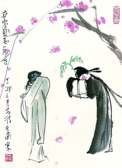 馬得的戲畫,善于把漫畫的夸張變形手法與中國畫水墨寫意的筆墨情趣巧妙地融合,獨具風貌,自成一派,不求形似,只求神韻。他畫《牡丹亭》中的人物,擅用單線勾成,線如游絲,迎風飄逸,稍敷淡色,略染腮紅,如入夢境,情意萬千。他畫的《游園·驚夢》《拾畫·叫畫》以及《蝴蝶夢》等,都是夢意濃重,因此被稱為“畫夢的人”。