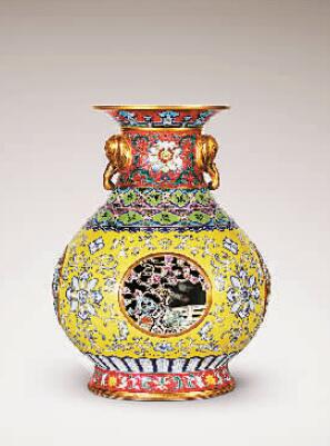 展出的仿清乾隆粉彩鏤空象耳轉(zhuǎn)心瓶 資料圖片