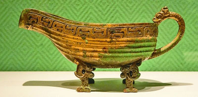 說到紋飾之美,就不得不提商周時期精美的青銅器,此次展覽也匯集了各地出土的多件青銅器精品,主要集中在第二單元展出。俞嘉馨介紹,商代和周代的青銅器在紋飾上有很大不同。商代青銅器多為滿飾,除了刻畫主體紋飾,還會用精細(xì)的紋樣填滿空白部分,好比在畫布上著了一層底色;而周代青銅器對主體紋飾塑造得非常細(xì)致,但對紋飾之間的空隙則做了留白處理。