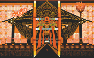 二是作品內(nèi)涵與形式語言要相諧相生。創(chuàng)作中,將中華木構(gòu)建筑作為畫面中心的主體,參考宋《營造法式》“大木作”圖樣,集合中國古代建筑最具特色的造型樣式:斗拱、梁柱結(jié)構(gòu)、大屋頂?shù)?,并突出其形體,意象表現(xiàn)出中華建筑文明的內(nèi)涵——既為生存之基礎(chǔ),亦為精神之棲所。