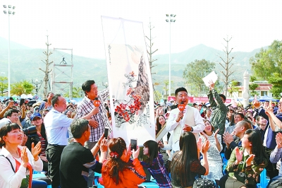 《鄉(xiāng)約》在攀枝花市東區(qū)錄制現(xiàn)場,當(dāng)?shù)厮囆g(shù)家向主持人展示書畫作品。 馮明仕攝/光明圖片