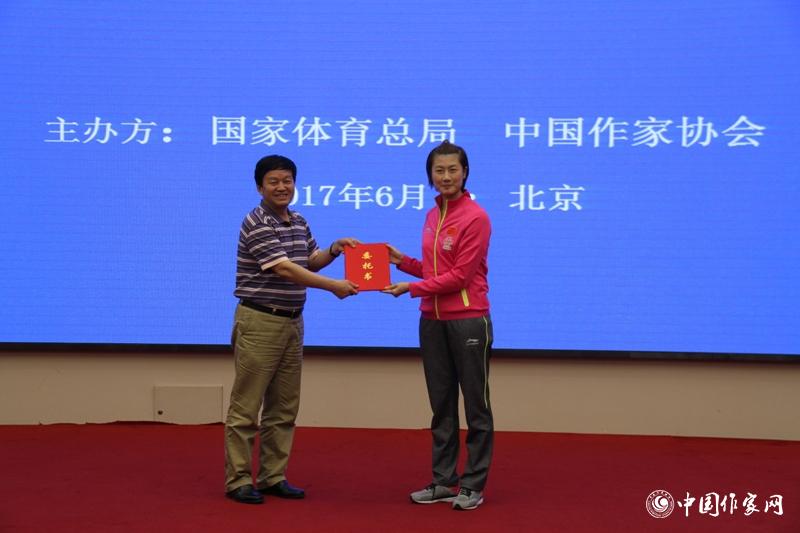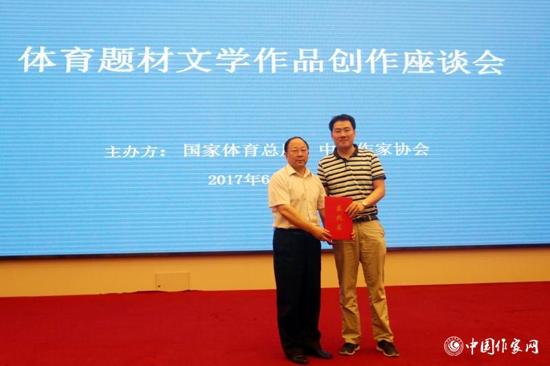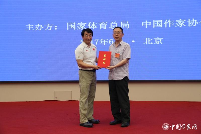 國(guó)家體育總局群眾體育司司長(zhǎng)劉國(guó)永向作家關(guān)仁山(顧超代表)遞交創(chuàng)作委托書(shū) 中國(guó)作家網(wǎng) 超俠 攝