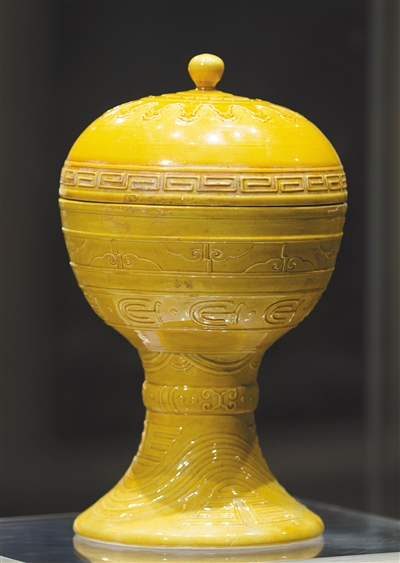光緒款黃釉帶蓋瓷豆。