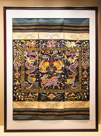 黎族魚躍龍騰雙鳳朝陽圖三聯(lián)幅龍被。