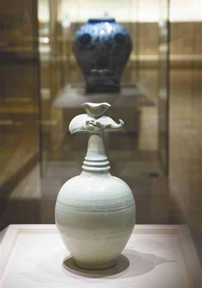 青白釉花口鳳首壺。