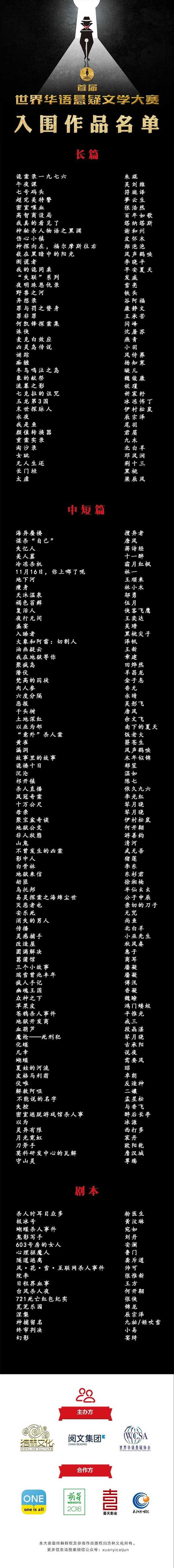 由上海浩林文化傳播股份有限公司攜手閱文集團(tuán)聯(lián)合主辦的首屆世界華語(yǔ)懸疑文學(xué)大賽,秉承公開、公平、公正的原則,已經(jīng)評(píng)選出139篇入圍作品: