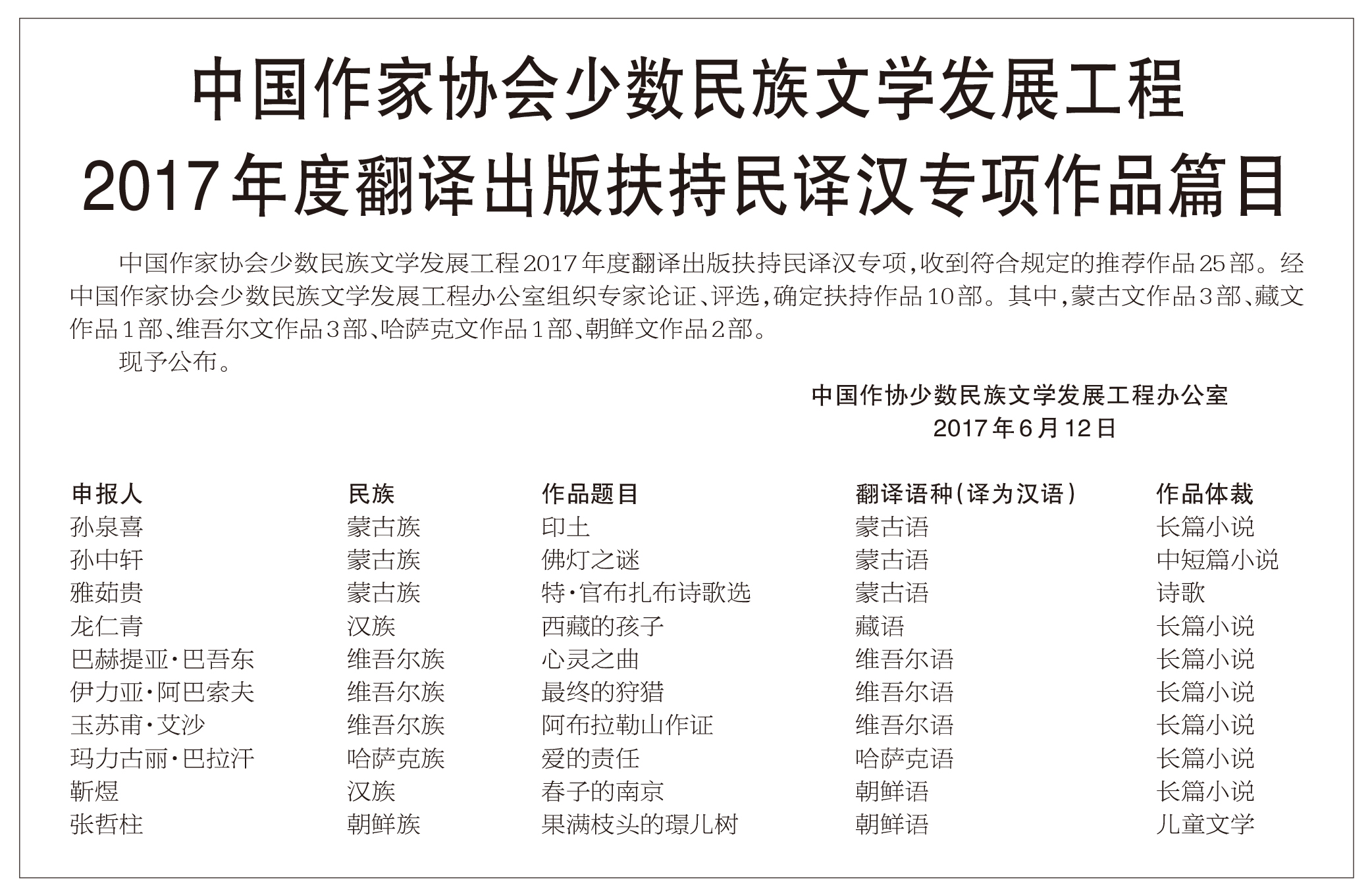 中國作家協(xié)會少數(shù)民族文學(xué)發(fā)展工程2017年度翻譯出版扶持民譯漢專項,收到符合規(guī)定的推薦作品25部。經(jīng)中國作家協(xié)會少數(shù)民族文學(xué)發(fā)展工程辦公室組織專家論證、評選,確定扶持作品10部。其中,蒙古文作品3部、藏文作品1部、維吾爾文作品3部、哈薩克文作品1部、朝鮮文作品2部。
