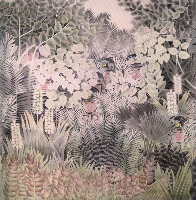 縱觀付詠珊的畫,多以工筆為主,格調(diào)高雅,題材多樣,個(gè)人風(fēng)格鮮明,富有濃郁的生活氣息。也許是身為軍人的緣故,她的大型畫作多為歌頌軍旅題材為主調(diào),如入選第十一屆全國美術(shù)作品展并被評為全軍優(yōu)秀作品的《潛伏》。從內(nèi)容上看,《潛伏》描繪的是一個(gè)充滿現(xiàn)代科技信息的軍事演習(xí)場景,在長寬均達(dá)兩米多的畫卷上,一支全副武裝的女兵小分隊(duì)三三兩兩隱匿在濃密的山野叢林中,她們神情警惕,目光犀利,精神抖擻,有的背著雷達(dá)、電臺等現(xiàn)代通訊工具,仿佛在整裝待命,有的手持望遠(yuǎn)鏡,仿佛在觀察敵情,渾身的迷彩已和碧綠的山色融為一體。從手法上看,《潛伏》是一幅大型工筆畫,畫家在設(shè)色方面采用了以淡墨、透明色為主的淡彩法,表現(xiàn)出一個(gè)淡雅清秀、朦朧靜幽的境界,畫面內(nèi)容豐富而含蓄。這幅畫作雖沒有威武雄壯的陣列,雖沒有排山倒海的氣勢,卻能以小見大,從一個(gè)側(cè)面形象生動(dòng)地反映了我軍英勇善戰(zhàn)的優(yōu)良傳統(tǒng)和朝氣蓬勃的精神風(fēng)貌,體現(xiàn)了科技強(qiáng)軍的卓著成果,更標(biāo)志著我軍在新的歷史時(shí)期已經(jīng)具備了履行新使命、完成多樣化軍事任務(wù)的能力。因而這幅畫不僅受到廣大部隊(duì)官兵的喜愛,也得到美術(shù)界同仁和專家學(xué)者的好評。真可謂,休說女兒筆墨無斤兩,內(nèi)有千軍萬馬藏。