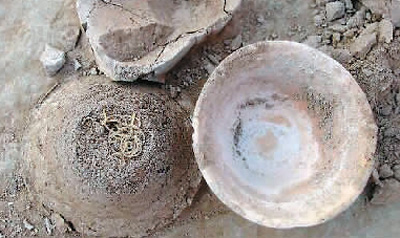 喇家遺址面條出土?xí)r的紅陶碗和碗中遺物