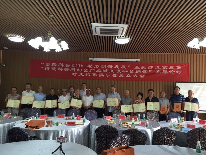 2017年6月25日,由中國(guó)科普作家協(xié)會(huì)主辦、成都時(shí)光幻象文化傳播有限責(zé)任公司承辦的“搭建科普科幻全產(chǎn)業(yè)鏈交流平臺(tái)探索”高層論壇——“繁榮科普創(chuàng)作 助力創(chuàng)新發(fā)展”系列沙龍第三期暨成都時(shí)光幻象俱樂部成立大會(huì)在成都溫江時(shí)光幻象公司娛樂部——楚天印象酒樓舉行。