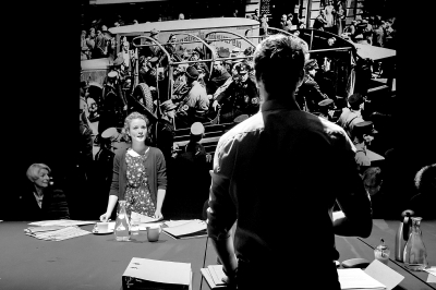 近年,紀(jì)錄劇場在中國業(yè)內(nèi)越來越受到關(guān)注,克羅辛格也介紹了他的工作方法。排練之前,他先和杜拉一起工作了半年時(shí)間,之后用7周跟演員一起工作。這個過程有點(diǎn)像在大學(xué)里的討論會,互相提出問題,直到最后,提出越來越精準(zhǔn)的問題?!拔业难輪T必須要讀很多文獻(xiàn),他們要熱衷于閱讀,并且是優(yōu)秀的演講者。因?yàn)楫?dāng)你在劇場里講出一段臺詞時(shí),你還要接下去解釋它?!闭劦郊o(jì)錄劇場中的表演,克羅辛格說,“如果演員太去‘演’,那么觀眾就沒事干了。我們要創(chuàng)作出一個個角色的身影,讓觀眾可以自由地去填充上色,自由決定你看到什么,你怎么想,角色身上發(fā)生了什么,他/她身處的情境是什么?!笨肆_辛格要求演員不能過度扮演,應(yīng)該有所節(jié)制?!斑@有點(diǎn)像極簡主義的表演、電影的表演。因?yàn)椤R頭’離你很近,所以你的反應(yīng)都要極簡化,得高度集中注意力?!?/p>