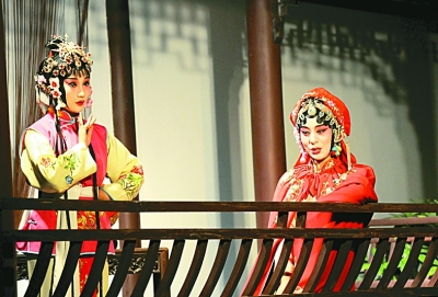 在蘇州昆劇傳習(xí)所,幾名青年演員表演實(shí)景版昆曲《牡丹亭》。王建中攝 光明圖片/視覺中國