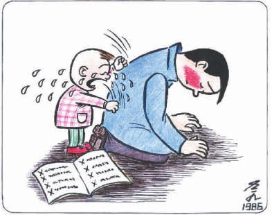 老九的漫畫有智慧。喜劇需要夸張,但夸張不是目的,夸張是要揭示出生活中的悖謬,讓悖謬在夸張中放大、突出,從而讓人從生活現(xiàn)象中發(fā)現(xiàn)和感受到悖謬。漫畫家的智慧,就是要用夸張的形象手法來展現(xiàn)悖謬,來制造喜劇效果。老九善于發(fā)現(xiàn)悖謬,善于制造這種喜劇,其手法是頗為巧妙的。比如,其郵票漫畫,常常把郵票上的畫面與郵票外的畫面合為一體,使郵票畫面具有了雙重身份:一方面仍然不失為郵票,一方面又成為更大畫面的組成部分,而且漫畫家能根據(jù)郵票畫面的內(nèi)容來構(gòu)思整個畫面,打破界限,化虛為實(shí),從而制造喜劇效果。甚至只是將兩個形象擺在一起,就構(gòu)成了一個張力場,如彌勒佛與蒙娜麗莎的那幅漫畫,兩個人物既有姿勢的相似又有形象的根本不同,于是頓時就有了喜劇性的笑。又如《爸爸,瞧你給我做的作業(yè)全錯了! 》 ,畫面是父子的地位發(fā)生了顛倒,父親跪在地上,一副愧疚的、做錯事接受懲罰的樣子,而兒子一面哭著一面用小手捶打父親,整個畫面極具喜劇效果,也是題材、手法完美結(jié)合的表現(xiàn)。又如《兔子取經(jīng)》 ,龜兔賽跑之后,兔子吸取教訓(xùn),居然也像烏龜一樣背上了重重的龜殼!這樣的情景,真是匠心獨(dú)運(yùn)。在這里,老九往往能夠突破日常思維習(xí)慣的束縛,創(chuàng)造出出乎人們意料、又合乎一定情理的作品。這樣,就創(chuàng)造出所謂的無理而妙。