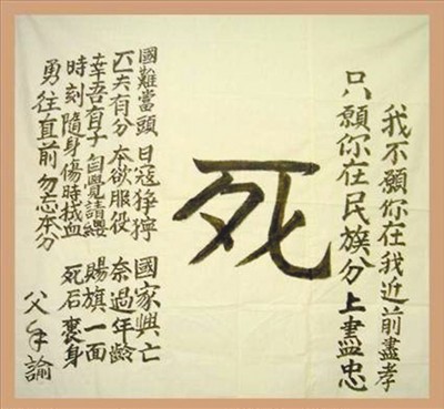 1937年七七事變后,中國全民族抗戰(zhàn)爆發(fā),四川安縣年輕人王建堂投筆從戎,串連組合起百十個具有同樣熱情志同道合的年輕人,大家一致請纓殺敵,意志堅決。王建堂出征前,父親王者誠寄來一面旗幟,鼓勵兒子為國捐軀,奮勇殺敵。旗的正中寫著蒼勁有力的“死”字?!八馈弊值淖笥覂蓚?cè)寫著幾行小字:右邊,“我不愿你在我近前盡孝;只愿你在民族分上盡忠?!弊筮叄皣y當頭,日寇猙獰。國家興亡,匹夫有分。本欲服役,奈過年齡。幸吾有子,自覺請纓。賜旗一面,時刻隨身。傷時拭血,死后裹身。勇往直前,勿忘本分”。