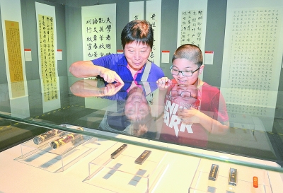 家規(guī)家訓(xùn)書法展上,祖孫一起觀看廉政楹聯(lián)。鄭帥攝 光明圖片/視覺中國