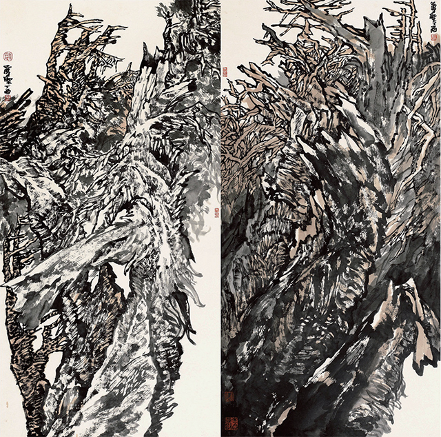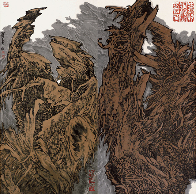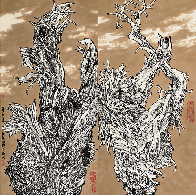 走進胡楊深處觀察感悟,三個千年的神奇,后兩個千年是表現(xiàn)的重點。粗大的樹干矗立于荒漠,樹葉被寒風(fēng)吹盡,枝杈被風(fēng)沙折斷,樹頭也被無情的歲月斬去,只有千年不倒的身軀傲然挺立,似人體雕塑的殘缺,皮膚、筋骨、血液,給人心靈的震顫。與天對吼的大嘴,與大漠狂舞的英姿,哭訴的胡楊淚,碩大的眼睛直視蒼穹,是渴望生命的神情,是不死不朽的傳情,無不發(fā)出內(nèi)心的吶喊和激蕩。手在抖心在跳,難以抑制的激情,無食、無眠,是出現(xiàn)滿意作品還是被胡楊的神情感動?在情與淚、水與墨的交融中,我找到了胡楊的“魂”與“神”。