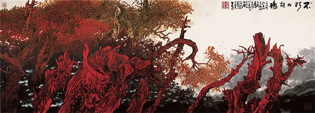 就這樣不倒、不朽從遠古站立到今天,我與胡楊相遇,用翰墨真情書寫不朽的胡楊。辦畫展不是為了證明什么,也不是比什么,重要的是在做什么,或能做什么,我只能畫畫,就盡我所能把畫畫好。感謝胡楊大樹,感謝中國畫藝術(shù),給了我一個以藝術(shù)的方式贊美生命的機會。