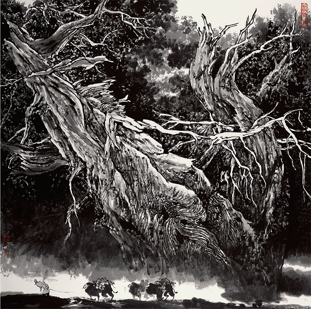 胡楊“生而千年不死,死而千年不倒,倒而千年不朽”這三個千年的生命傳奇,令人感嘆敬畏,也是我多年畫新疆要表現(xiàn)的題材之一。思考很久卻找不到酣暢落筆的激情,而苦于胡楊高貴的生命和超凡的氣節(jié)如何用水墨表現(xiàn)。