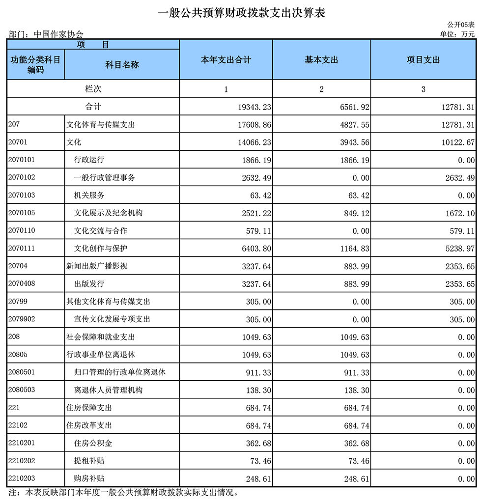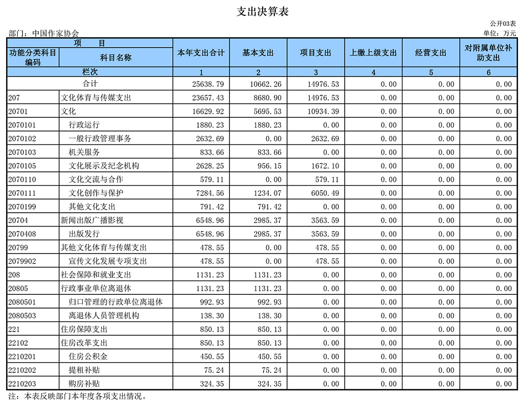 七、文化體育與傳媒(類)文化(款)行政運(yùn)行(項(xiàng)):指中國(guó)作協(xié)本級(jí)行政人員工資及機(jī)構(gòu)正常運(yùn)轉(zhuǎn)、履行職責(zé)所需的基本支出。