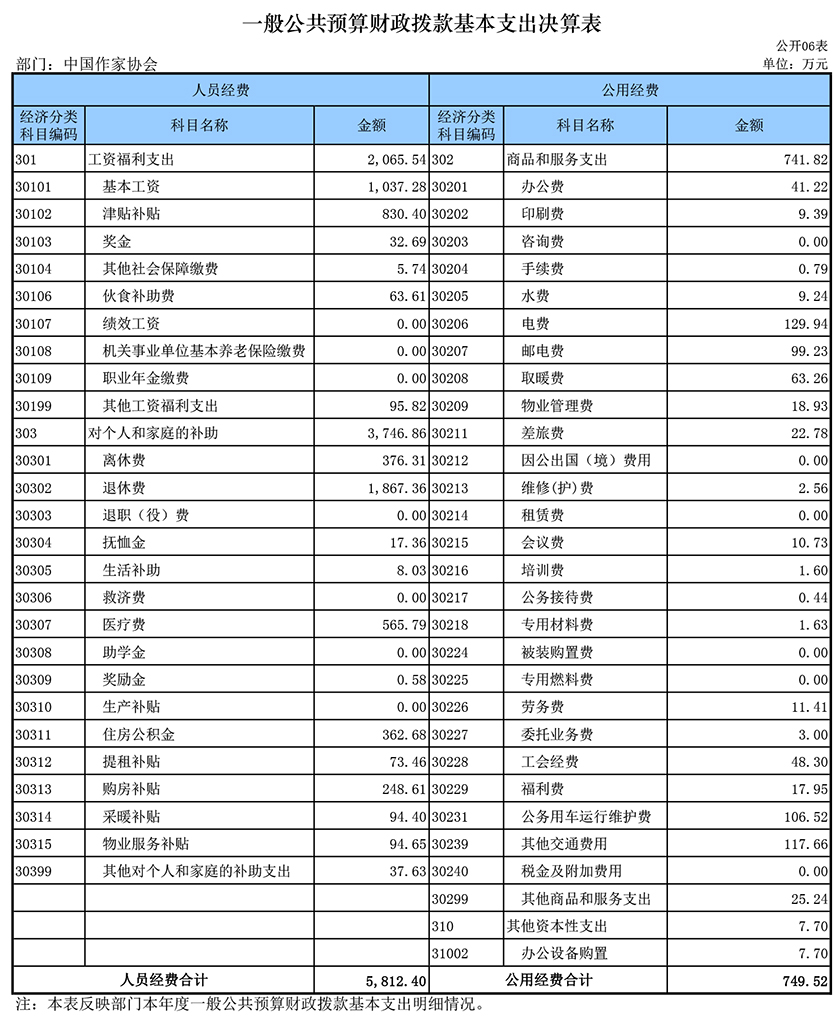 六、關(guān)于中國(guó)作協(xié)2016年度一般公共預(yù)算財(cái)政撥款基本支出決算情況說明