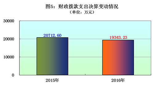 中國(guó)作協(xié)2016 年度財(cái)政撥款支出19343.23萬元, 占本年支出合計(jì)的75.45%。與 2015 年相比,財(cái)政撥款支出減少1369.37萬元,下降6.61%。