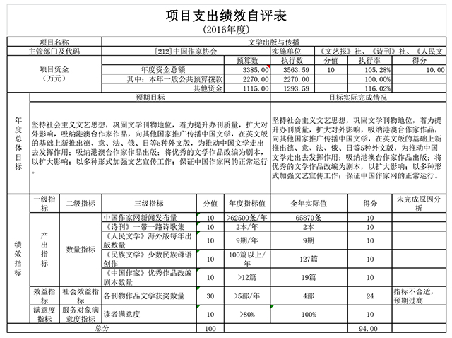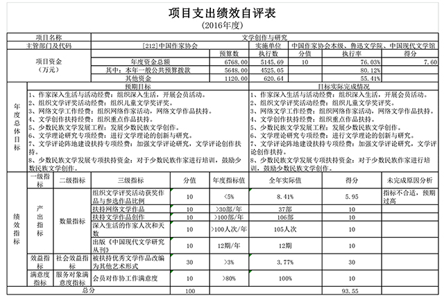 根據(jù)年初設(shè)定的績(jī)效目標(biāo), “文學(xué)創(chuàng)作與研究”項(xiàng)目自評(píng)得分為93.55 分。發(fā)現(xiàn)的主要問題及原因:一是年初設(shè)置的個(gè)別指標(biāo)不合理;二是部分二級(jí)項(xiàng)目執(zhí)行進(jìn)度較慢。下一步改進(jìn)措施:增強(qiáng)指標(biāo)設(shè)置的科學(xué)性,加快預(yù)算執(zhí)行進(jìn)度。