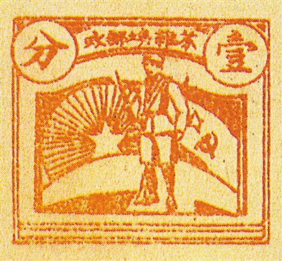 最早出現(xiàn)在郵票上的人民軍隊形象,是對第一次國內(nèi)革命戰(zhàn)爭時期的紅軍戰(zhàn)士的刻畫——1932年,中華蘇維埃共和國郵政發(fā)行第一套郵票,7枚郵圖上有題為“戰(zhàn)士圖”和“沖鋒圖”的圖案。紅軍戰(zhàn)士持槍(圖②)與沖鋒的形象,第一次出現(xiàn)在郵票上。這套郵票,在普通的白紙和報紙上,以石印版印制,票面粗糙,沒有齒孔,卻是表現(xiàn)人民軍隊形象最早的郵票。1990年,在“中國人民革命戰(zhàn)爭時期郵票發(fā)行60周年”紀(jì)念郵票中,郵圖利用“票中票”形式,讓人們再次領(lǐng)略了紅軍戰(zhàn)士的風(fēng)采。