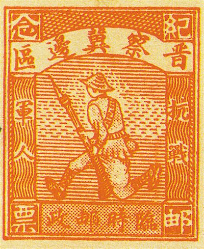 抗日戰(zhàn)爭中,人民軍隊是抗戰(zhàn)的“中流砥柱”。1938年,晉察冀邊區(qū)臨時郵政總局發(fā)行了“軍人免資貼用”郵票,即珍郵“抗日軍人圖”(圖③)。這枚郵票,留下了那個艱苦年代的印記。畫面以質(zhì)樸簡約的線條,勾勒出抗日軍人持槍向前線的形象。頗具時代感的勁礪的木刻風(fēng)格,富有動感和感召力,雖不華但有氣度,雖簡單但蘊內(nèi)涵。紅色的單色印制,又若烽火燃起的戰(zhàn)場,具有引發(fā)聯(lián)想和置身實地的雙重藝術(shù)效果。