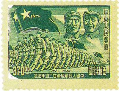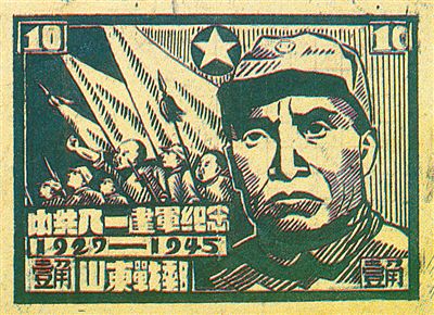 1945年10月,山東解放區(qū)的山東戰(zhàn)時郵務(wù)總局發(fā)行了第一枚“中共八一建軍紀(jì)念”郵票(圖⑨)。這一枚郵票,主圖是朱德總司令威嚴(yán)的戎裝肖像,背景是軍旗引導(dǎo)下的軍隊行進。主圖之外的邊飾,印有“中共八一建軍紀(jì)念”“1927—1945”和“山東戰(zhàn)郵”的字樣。