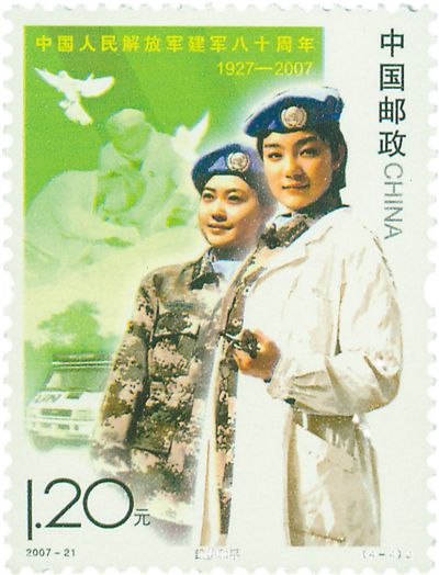 2007年發(fā)行的建軍紀(jì)念郵票,全方位表現(xiàn)了人民軍隊的神圣職責(zé)。郵票上,第一次出現(xiàn)了軍旗輝映下的抗洪搶險場面,以及參與聯(lián)合國維和行動的中國軍人的英姿(圖⑧)。這套郵票以“聽黨指揮”“服務(wù)人民”“英勇善戰(zhàn)”和“維護和平”四幅郵圖,表現(xiàn)了可以信賴、可以依靠的人民軍隊。新世紀(jì)的絢麗色調(diào),讓這套具有革命傳統(tǒng)的主題郵票,有了煥然一新的神采面貌。