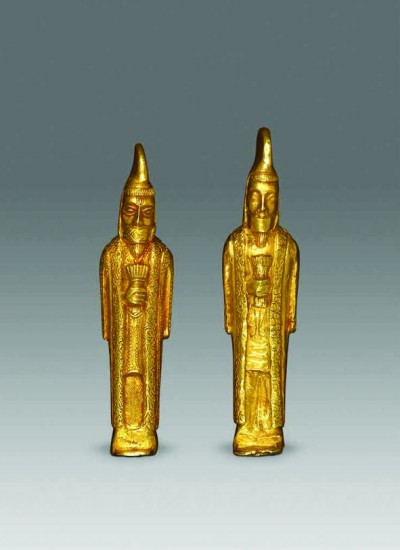 我們?yōu)橐恍﹣?lái)自中國(guó)以外地區(qū)的展品也配上了我館的藏品加以比照說(shuō)明,這一部分以我館收藏的絲綢之路古代國(guó)家錢幣為主。比如第五十六號(hào)展品,來(lái)自印度的濕婆和雪山神女像,我們就配上了館藏的貴霜王朝波調(diào)一世金幣,顯示了貴霜王朝時(shí)期濕婆信仰在中亞地區(qū)的影響。又比如第四十三號(hào)展品:阿卜杜勒·馬利克金幣,這種由阿卜杜勒·馬利克在七世紀(jì)創(chuàng)造的摒棄哈里發(fā)形象、僅以《古蘭經(jīng)》箴言文字作為裝飾的錢幣新樣式,一直沿用到二十世紀(jì)初。我們?yōu)樗渖狭损^藏的蒙古帝國(guó)成吉思汗金幣,雖然金幣是晚至十三世紀(jì)初鑄造的,但像這樣標(biāo)明大汗全名和制造地、年份等信息的金幣,極為罕見珍貴。又比如第二十五號(hào)展品:奧克蘇斯的瑣羅亞斯德教徒像,我們就配上了館藏的安息王朝阿薩西斯一世銀幣,銀幣年代晚于教徒像,我們想通過(guò)銀幣上安息帝國(guó)國(guó)王頭戴的風(fēng)帽,展示塞族人的風(fēng)帽→教徒像上的風(fēng)帽→安息國(guó)王頭上的風(fēng)帽這樣一條影響鏈條,最終說(shuō)明塞族人文化對(duì)伊朗高原的影響。
