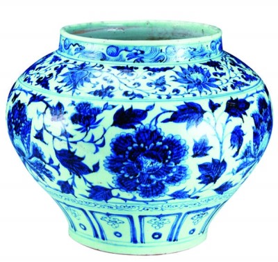 上博:是的。再比如第六十七號(hào)展品:元青花盤,形制規(guī)整精巧,花紋繁復(fù)縝密,色彩幽菁可愛(ài),是元青花瓷器中的精品。但是如果記性好一點(diǎn)的觀眾就會(huì)發(fā)現(xiàn),大英博物館的這件元青花盤在2012年上海博物館舉辦元青花瓷器大展時(shí)就已經(jīng)來(lái)過(guò)上海了,此次再來(lái),可見其在大英博物館中的重要地位。我們配上了館藏的元青花纏枝牡丹紋罐,相比之下,呈現(xiàn)的是相對(duì)活潑的風(fēng)格。