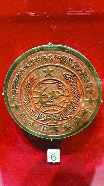來到“在土地革命戰(zhàn)爭中誕生成長”展區(qū),可以看到明亮的玻璃柜里陳放著一枚醒目的大印,即“中華蘇維埃共和國執(zhí)行委員會人民委員會革命軍事委員會”印。